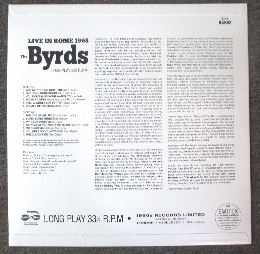 Of the eleven songs played at the Piper Club, four were from the forthcoming LP, which was not released until August 30th. One of these was set-opener You Ain’t Going Nowhere, although this provided a link with the past as one of many Bob Dylan songs covered by the band. Hillman’s Old John Robertson had featured some country-picking when it appeared on the Notorious Byrd Brothers LP and it fits right into the new direction here. Parsons heartfelt vocal on You Don’t Miss Your Water supported by Dillard’s banjo provides irrefutable proof of the bands new direction delivering what Parsons would later term “Cosmic American Music” – a hybrid of country, rhythm and blues, soul, folk, and rock. Gram’s Hickory Wind is a haunting requiem for lost youth, written on a lengthy train ride from Chicago to Los Angeles. It’s back to more familiar territory with I’ll Feel A Whole Lot Better, McGuinns’ 12 string and vocal taking us back to June 1965 (albeit with added banjo). From the Byrds second LP Chimes Of Freedom and Turn! Turn Turn! both receive an enthusiastic welcome, harmonies immaculate throughout. In between comes another soulful Parsons vocal on The Christian Life. An upbeat My Back Pages features some interplay between electric guitar and organ (probably played by Parsons) as it evolves into an improbable boogie version of Baby, What You Want Me To Do ? Finally Mr Spaceman – another early Byrds song whose country leanings are emphasised in this arrangement.