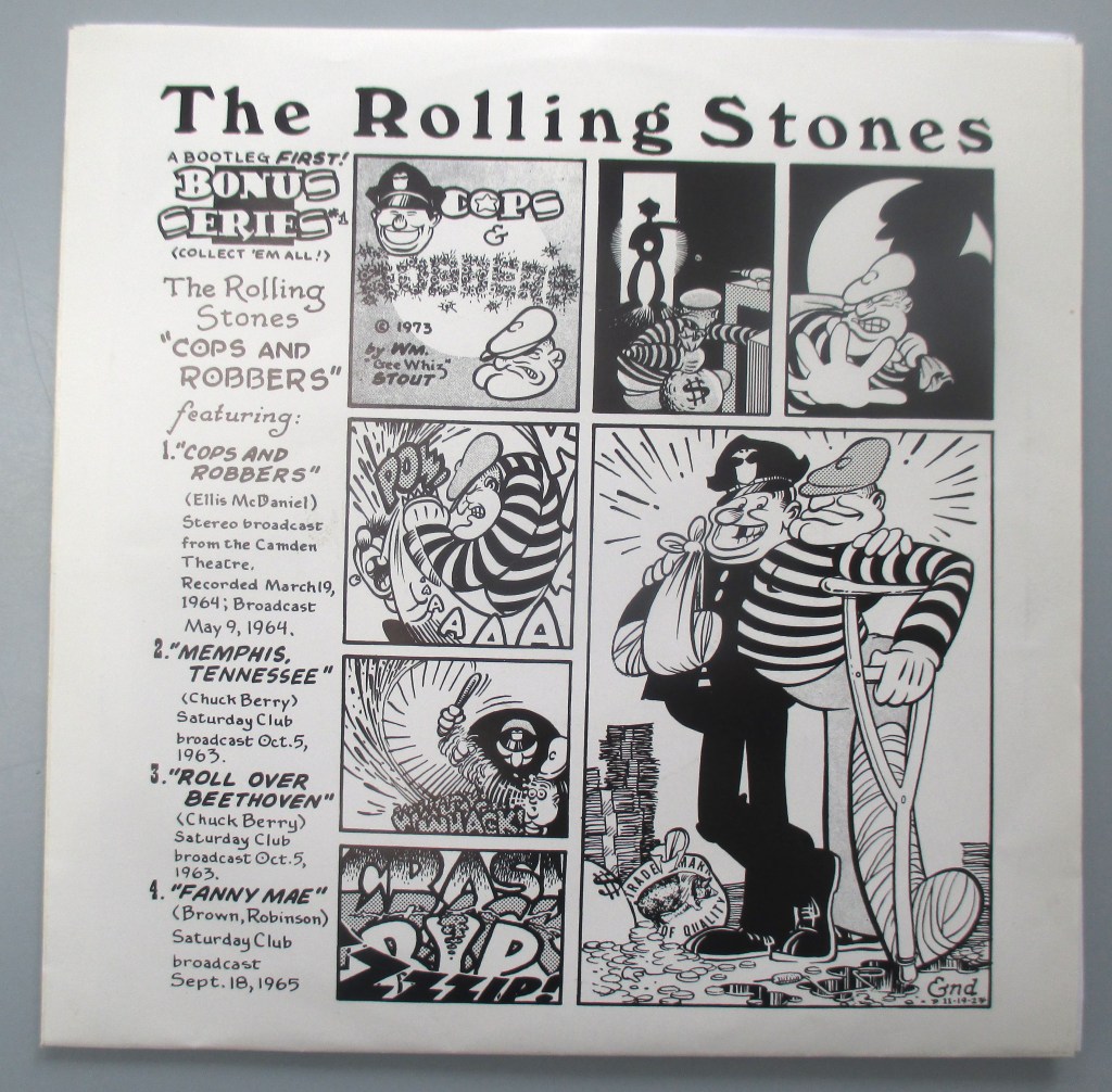 I have wanted to own a copy of this 7″ vinyl ever since seeing it featured in Roy Carr and CSM’s 1976 book The Rolling Stones: An Illustrated Record. Thanks to the BBC On Air official release and a plethora of bootlegs we now know what the tracks sound like – speedy and great fun. Fanny Mae provides the tune for The Under Assistant West Coast Promo Man. Memphis Tennessee and Roll Over Beethoven crackle with youthfull energy. Cops And Robbers itself provides the inspiration for the brilliant William Stout cartoon cover, as good as his design for Tales From The Who. Thank you Jo from iorr.org for having a clear out!