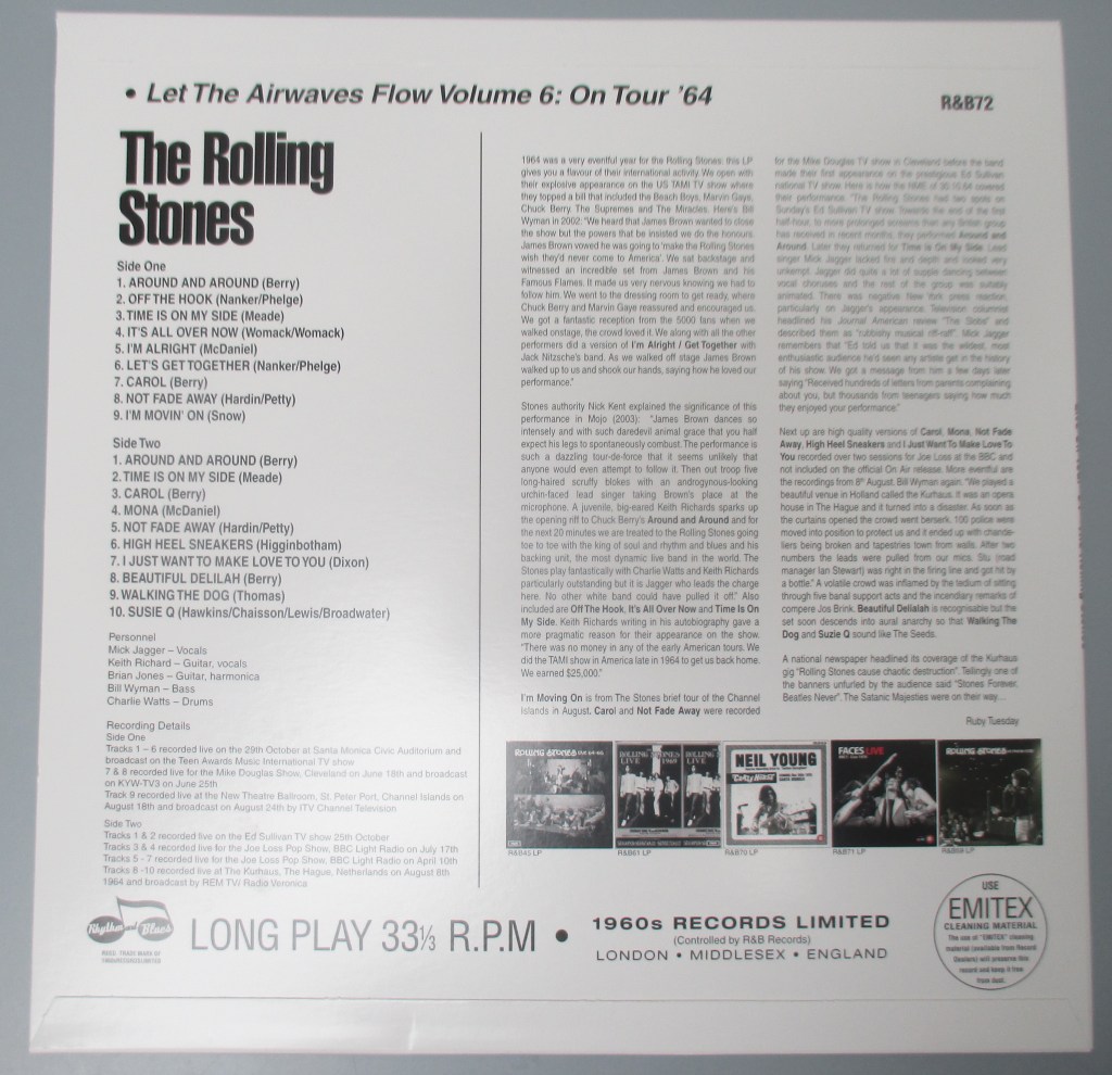 1964 was a very eventful year for the Rolling Sones: this LP gives you a flavour of their international activity. We open with their explosive appearance on the US TAMI TV show where they topped a bill that included the Beach Boys, Marvin Gaye, Chuck Berry. The Supremes and The Miracles Here’s Bill Wyman in 2002. “We heard that James Brown wanted to close the show but the powers that be insisted we do the honours. James Brown vowed he was going to ‘make the Rolling Stones wish they’d never come to America’. We sat backstage and witnessed an incredible set from James Brown and his Famous Flames. It made us very nervous knowing we had to follow him. We went to the dressing room to get ready, where Chuck Berry and Marvin Gaye reassured and encouraged us. We got a fantastic reception from the 5000 fans when we walked onstage, the crowd loved it. We along with all the other performers did a version of I’m Alright / Get Together with Jack Nitzche’s band. As we walked off stage James Brown walked up to us and shook our hands, saying how he loved our performance.”