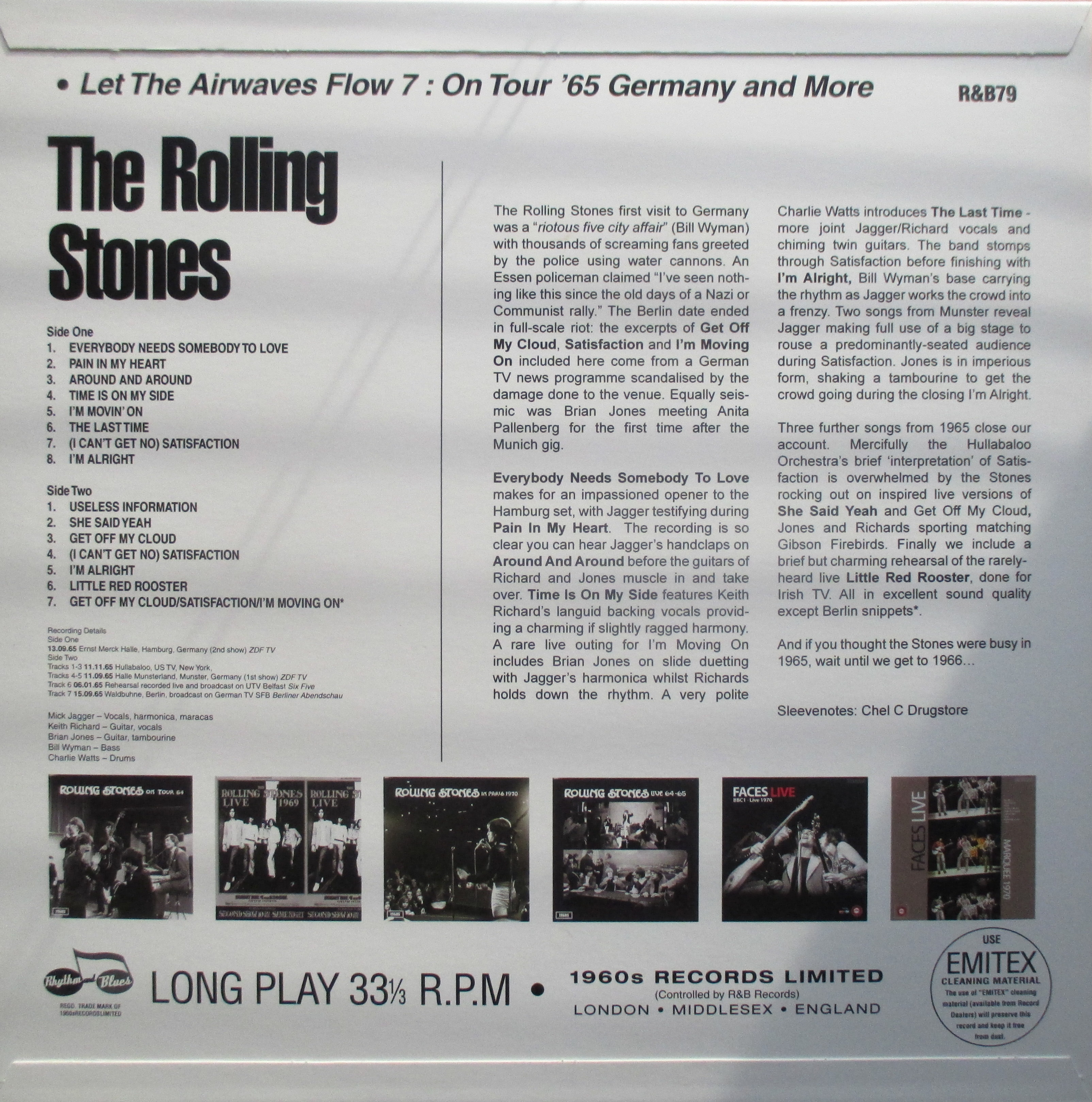 Three further songs from 1965 close our account. Mercifully the Hullabaloo Orchestra’s brief ‘interpretation’ of Satisfaction is overwhelmed by the Stones rocking out on inspired live versions of She Said Yeah and Get Off My Cloud, Jones and Richards sporting matching Gibson Firebirds. An added delight is a brief but charming rehearsal of the rarely-heard live Little Red Rooster, done for Irish TV. Sound quality on this release is excellent throughout, although the Berlin song fragments betray their origin as news footage.