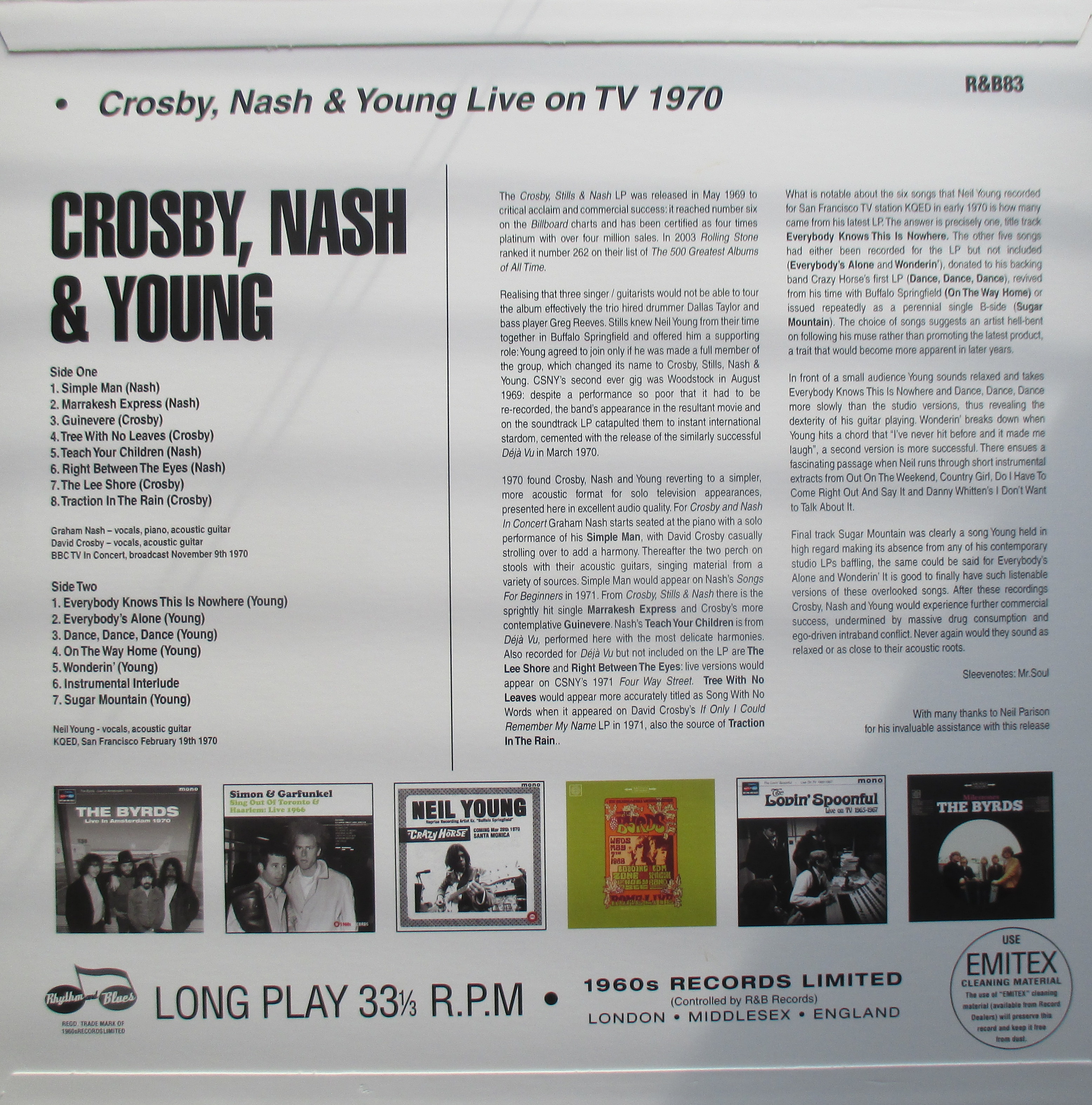 1970 found Crosby, Nash and Young reverting to a simpler, more acoustic format for solo television appearances, presented here in excellent audio quality. For Crosby and Nash In Concert Graham Nash starts seated at the piano with a solo performance of his Simple Man, with David Crosby casually strolling over to add a harmony. Thereafter the two perch on stools with their acoustic guitars, singing material from a variety of sources. Simple Man would appear on Nash’s Songs For Beginners in 1971. From Crosby, Stills & Nash there is the sprightly hit single Marrakesh Express and Crosby’s more contemplative Guinevere. Nash’s Teach Your Children is from Déjà Vu, performed here with the most delicate harmonies. Also recorded for Déjà Vu but not included on the LPare The Lee Shore and Right Between The Eyes: live versions would appear on CSNY’s 1971 Four Way Street. Tree With No Leaves would appear more accurately titled as Song With No Words when it appeared on David Crosby’s If Only I Could Remember My Name LP in 1971, also the source of Traction In The Rain..