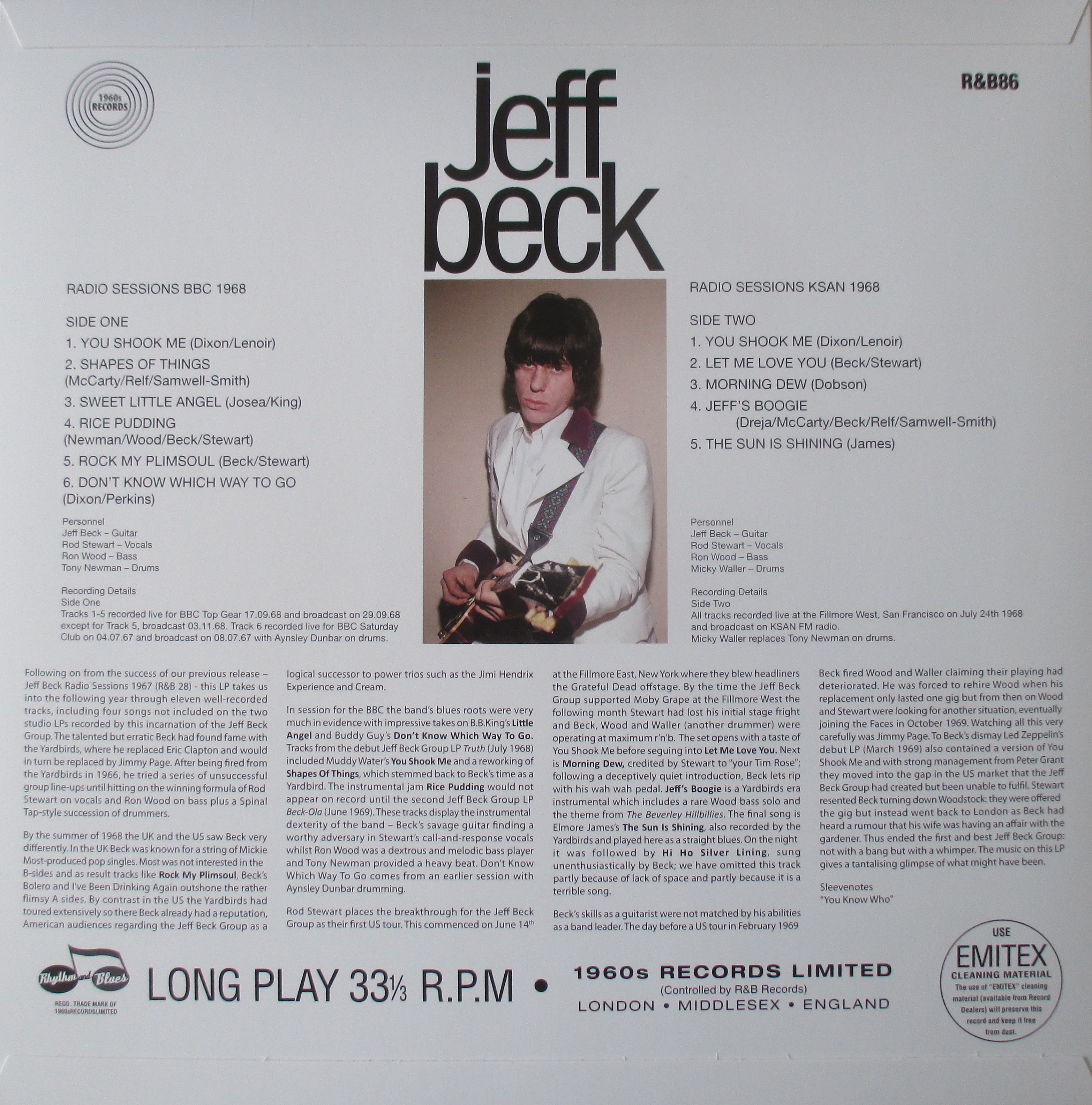 Following on from the success of our previous release – Jeff Beck Radio Sessions 1967 (R&B 28) – this LP takes us into the following year through eleven well-recorded tracks, including four songs not included on the two studio LPs recorded by this incarnation of the Jeff Beck Group.
