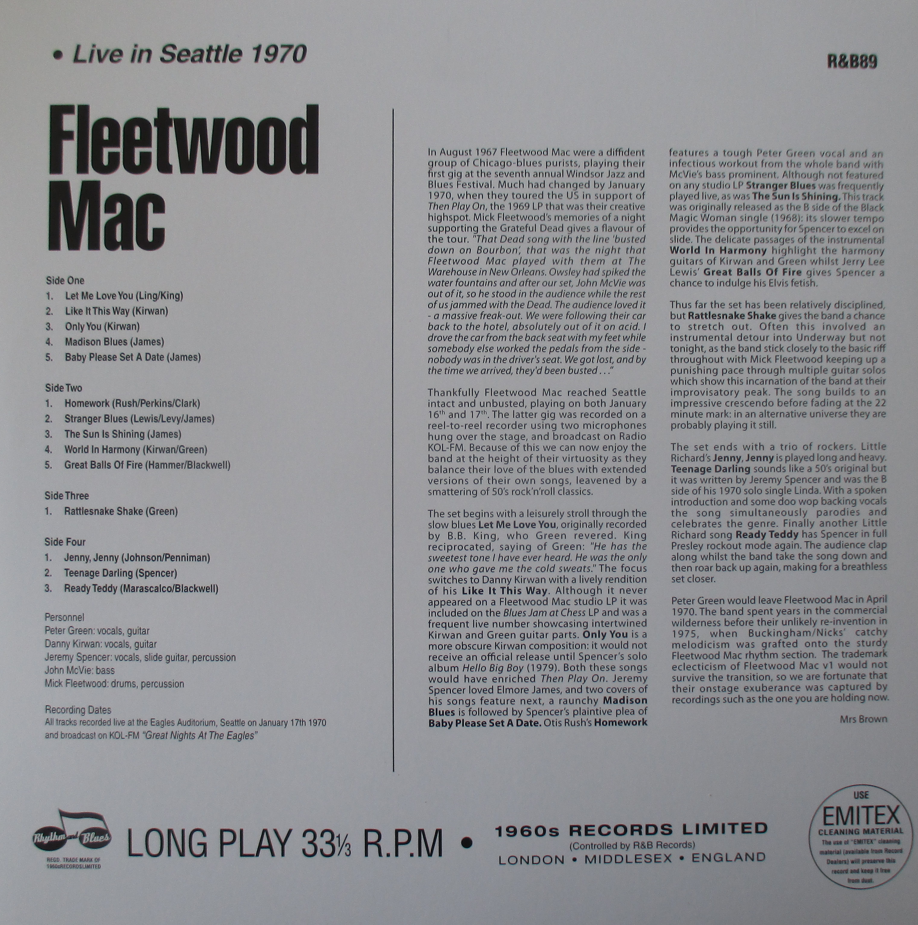 Thankfully Fleetwood Mac reached Seattle intact and unbusted, playing on both January 16th and 17th. The latter gig was recorded on a reel-to-reel recorder using two microphones hung over the stage, the excellent quality results were broadcast on Radio KOL-FM. Because of this we can now enjoy the band at the height of their virtuosity as they balance their love of the blues with extended versions of their own songs, leavened by a smattering of 50’s rock’n’roll classics.