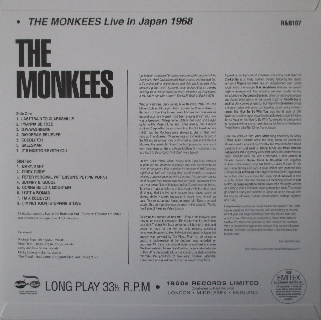Following the success of their 1967 US tour, the following year The Monkees toured Australia and Japan. The results were far better than expected. The four Monkees performed all the instruments and vocals for most of the live set, only needing additional instrumental support for their individual solo spots. In Japan this support was provided by The Floral. From the six shows in Japan, a performance at the Budokan was recorded for Japanese TV. Sadly the original video is now lost and even Monkees archivist Andrew Sandoval has been unable to locate it. This LP is the soundtrack to that concert, carefully edited to minimise the presence of two very intrusive Japanese announcers who talk over the start of every track.