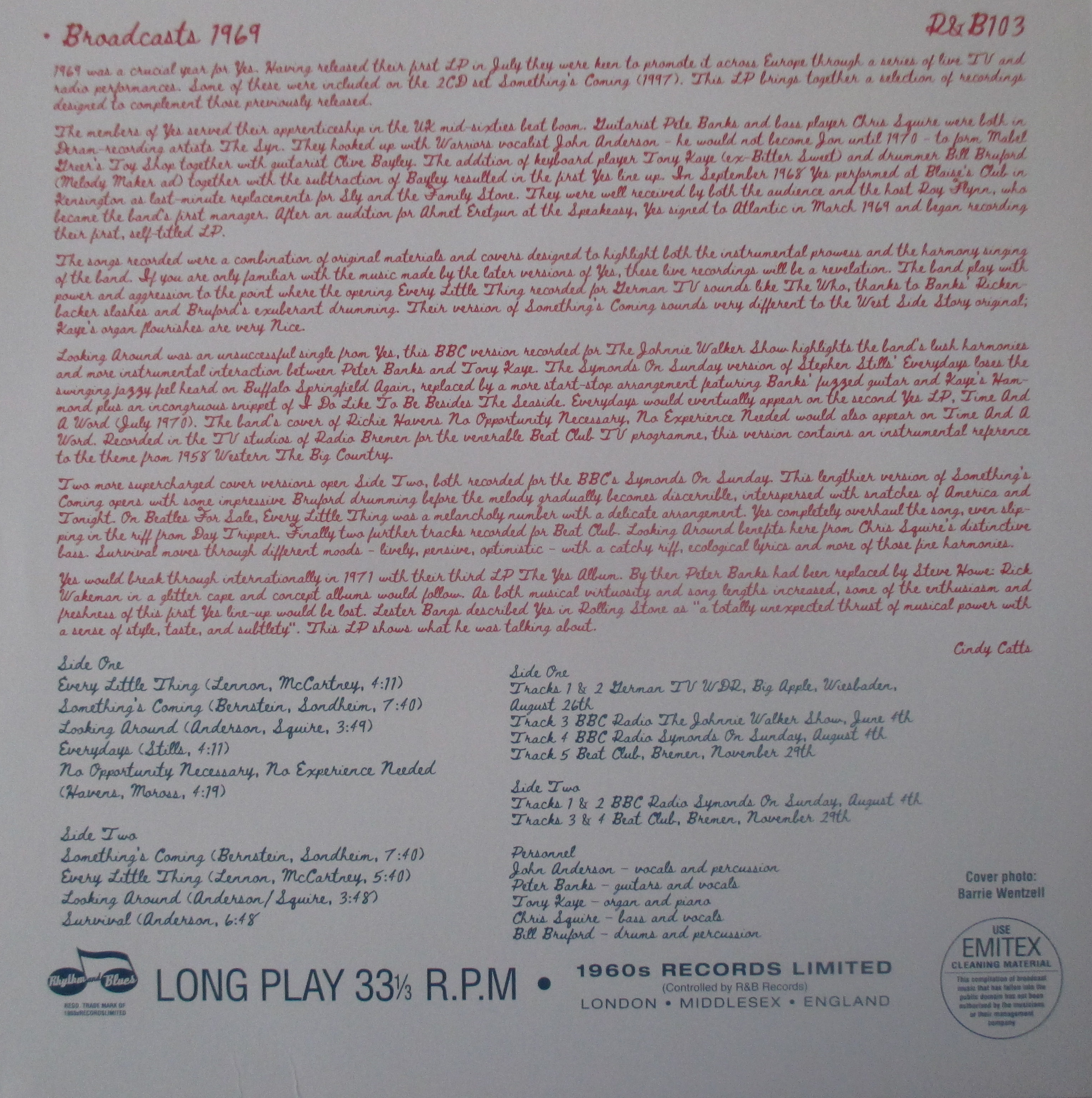1969 was a crucial year for Yes. Having released their first LP in July they were keen to promote it across Europe through a series of live TV and radio performances. Some of these were included on the 2CD set Something’s Coming (1997). This LP brings together a selection of high quality recordings designed to complement those previously released.