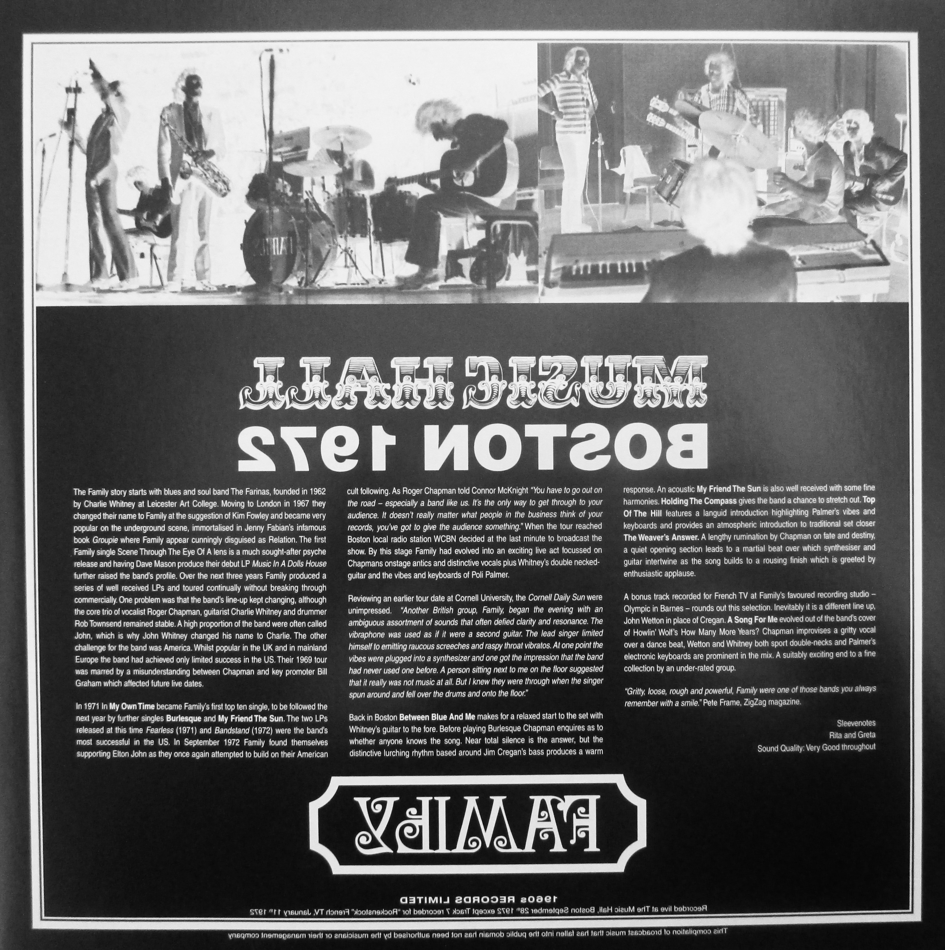 In 1971 In My Own Time became Family’s first top ten single, to be followed the next year by Burlesque and My Friend The Sun. The two LPs released at this time Fearless (1971) and Bandstand (1972) were the bands most successful in the US. Accordingly September 1972 found Family supporting Elton John as they once again attempted to build on their American cult following. As Roger Chapman told Connor McKnight “You have to go out on the road – especially a band like us. It’s the only way to get through to your audience. It doesn’t really matter what people in the business think of your records, you’ve got to give the audience something.“ When the tour reached Boston local radio station WCBN decided at the last minute to broadcast the show. By this stage Family had evolved into an exciting live act focussed on Chapmans onstage antics and distinctive vocals plus Whitney’s double necked-guitar and the vibes and keyboards of Poli Palmer.