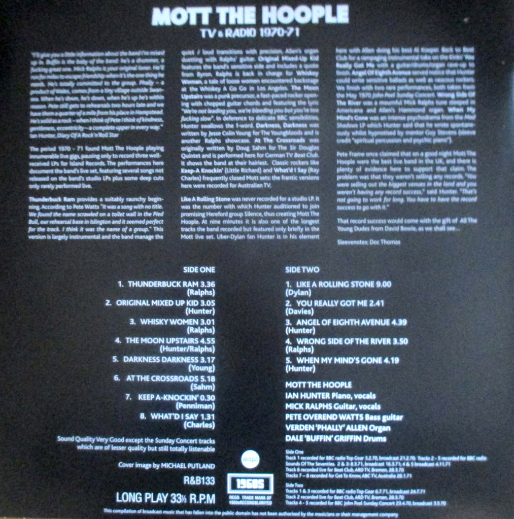Like A Rolling Stone was never recorded for a studio LP. It was the number with which Hunter auditioned to join promising Hereford group Silence, thus creating Mott The Hoople. At nine minutes it is also one of the longest tracks the band recorded but featured only briefly in the Mott live set. Uber-Dylan fan Hunter is in his element here with Allen doing his best Al Kooper. Back to Beat Club for a rampaging instrumental take on the Kinks’ You Really Got Me with a guitar/drums/organ rave-up to finish. Angel Of Eighth Avenue served notice that Hunter could write sensitive ballads as well as raucous rockers. We finish with two rare performances, both taken from the May 1970 John Peel Sunday Concert. Wrong Side Of The River was a mournful Mick Ralphs tune steeped in Americana and Allen’s Hammond organ. When My Mind’s Gone was an intense psychodrama from the Mad Shadows LP which Hunter said that he wrote spontaneously whilst hypnotised by mentor Guy Stevens (sleeve credit “spiritual percussion and psychic piano”).