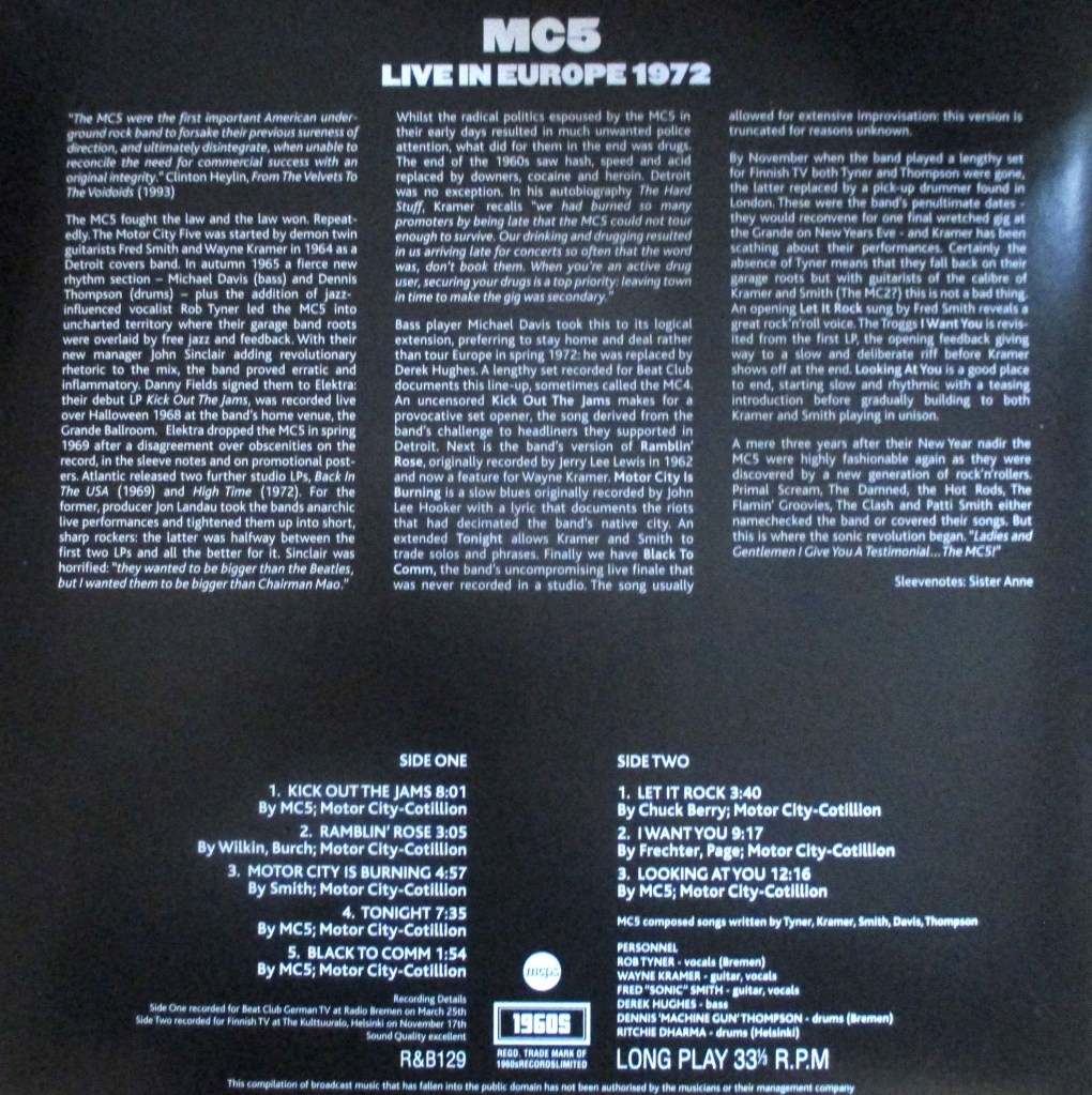 Bass player Michael Davis took this to its logical extension , preferring to stay home and deal rather than tour Europe in spring 1972: he was replaced by Derek Hughes. A lengthy set recorded for Beat Club documents this line-up, sometimes called the MC4. An uncensored Kick Out The Jams makes for a provocative set opener, the song derived from the band’s challenge to headliners they supported in Detroit. Next is the band’s version of Ramblin’ Rose, originally recorded by Jerry Lee Lewis in 1962 and now a feature for Wayne Kramer. Motor City Is Burning is a slow blues originally recorded by John Lee Hooker with a lyric that documents the riots that had decimated the band’s native city. Finally an extended Tonight allows Kramer and Smith to trade solos and phrases.