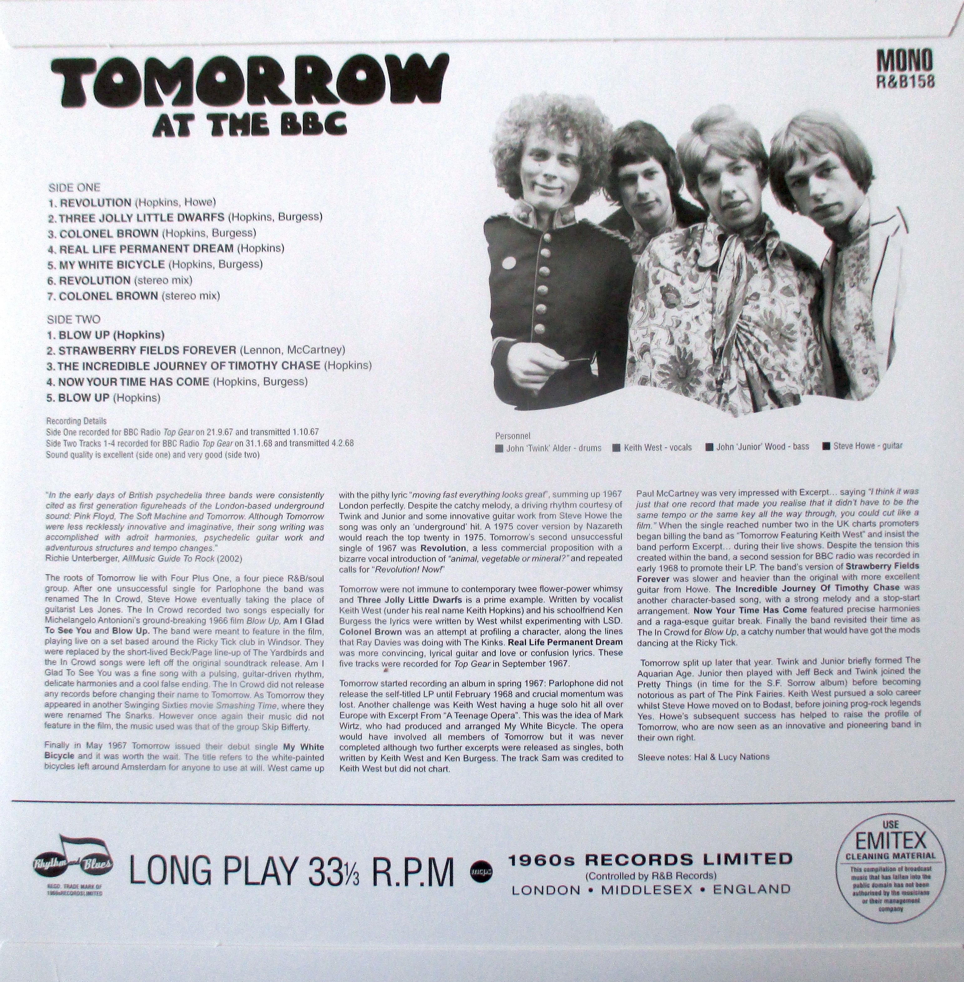 Tomorrow were not immune to contemporary twee flower-power whimsy and Three Jolly Little Dwarfs is a prime example. Written by vocalist Keith West (under his real name Keith Hopkins) and his schoolfriend Ken Burgess the lyrics were written by West whilst experimenting with LSD. Colonel Brown was an attempt at profiling a character, along the lines that Ray Davies was doing with The Kinks. Real Life Permanent Dream was more convincing, lyrical guitar and love or confusion lyrics. These five tracks were recorded for Top Gear in September 1967.