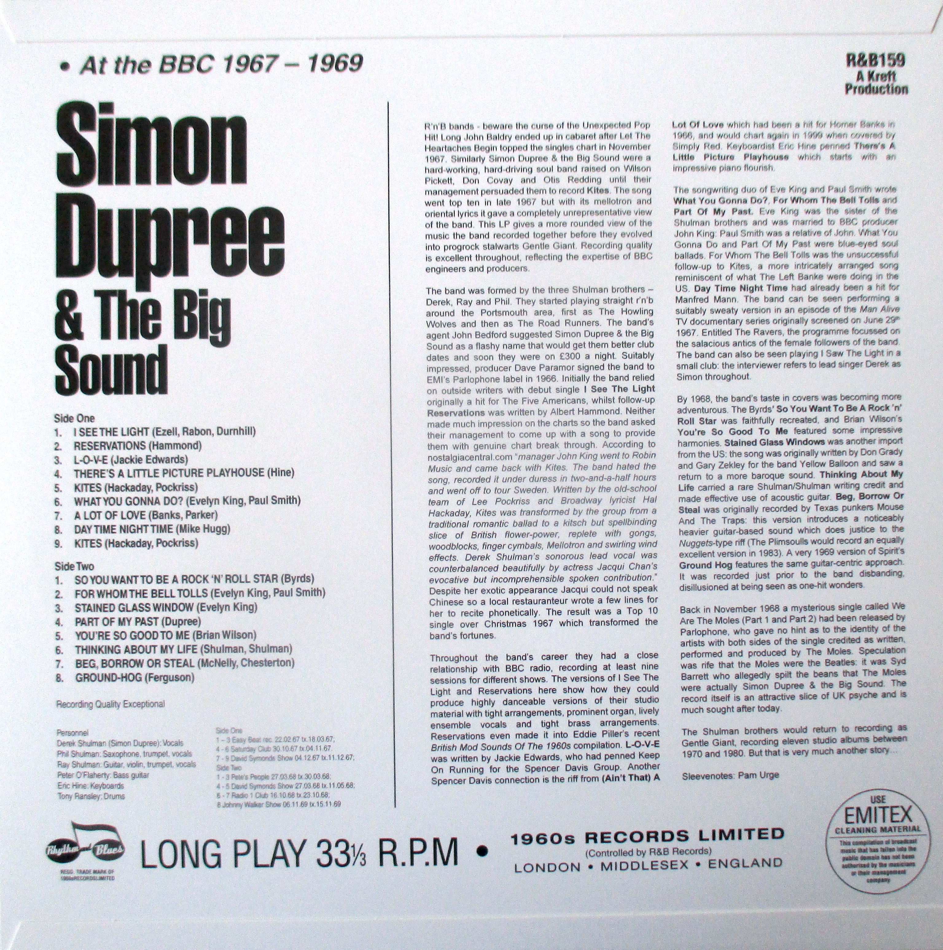 R’n’B bands – beware the curse of the Unexpected Pop Hit! Long John Baldry ended up in cabaret after Let The Heartaches Begin topped the singles chart in November 1967. Similarly Simon Dupree & the Big Sound were a hard-working, hard-driving soul band raised on Wilson Pickett, Don Covay and Otis Redding until their management persuaded them to record Kites. The song went top ten in late 1967 but with its mellotron and oriental lyrics it gave a completely unrepresentative view of the band. This LP gives a more rounded view of the music the band recorded together before they evolved into progrock stalwarts Gentle Giant. Recording quality is excellent throughout, reflecting the expertise of BBC engineers and producers.