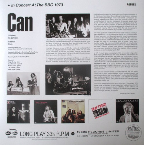 In 1971 the single Spoon became a top ten hit in Germany after being used as the theme song to the television mini-series Das Messer. The success of the single allowed Can to establish their own Inner Space studio in North Rhine-Westphalia. Here they recorded the rest of their third album for United Artists, Ege Bamyasi (November 1972). Promoting this LP during their second UK tour in February 1973, Can recorded expanded versions of the tracks I’m So Green and Pinch for In Concert. No attempt was made to recreate the original studio tracks. Instead, in the words of long-time Can watcher Kris Needs “familiar riffs, melodies or grooves appear fleetingly like passing scenery on a train.”
