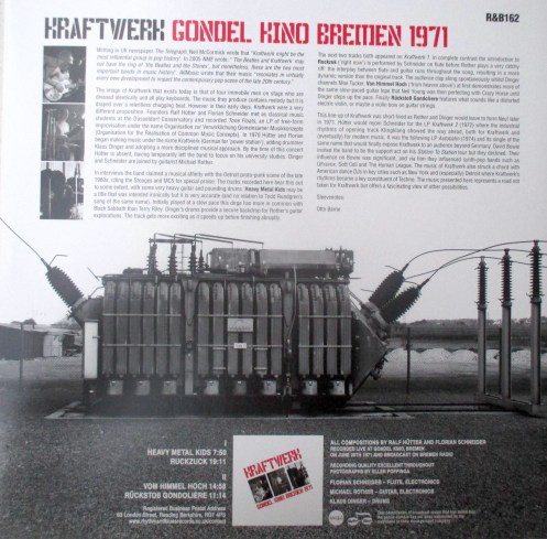 In interviews the band claimed a musical affinity with the Detroit proto-punk scene of the late 1960s, citing the Stooges and MC5 for special praise. The tracks recorded here bear this out to some extent, with some very heavy guitar and pounding drums. Heavy Metal Kids may be a title that was intended ironically but it is very accurate (and no relation to Todd Rundgren’s song of the same name). Initially played at a slow pace this dirge has more in common with Black Sabbath than Terry Riley. Dinger’s drums provide a secure backdrop for Rother’s guitar explorations. The track gets more exciting as it speeds up before finishing abruptly. The next two tracks appeared on Kraftwerk 1. In complete contrast the introduction to Ruckzuck (‘right now’) isperformed by Schneider on flute before Rother plays a very catchy riff: the interplay between flute and guitar runs right through the song, resulting in a more dynamic version than the original track.The audience clap along spontaneously whilst Dinger channels Moe Tucker. Von Himmel Hoch (‘from heaven above’) at first seems more of the same slow-paced guitar lope that Neil Young was then perfecting with Crazy Horse until Dinger steps up the pace. Finally Rückstoss Gondoliere features what sounds like a distorted electric violin, or maybe a violin bow on guitar strings.