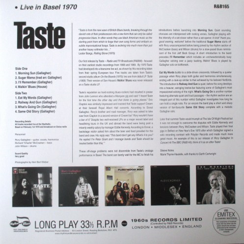 Our first release by Taste – Radio and TV Broadcasts (R&B99) – focused on their earliest studio recordings from 1968 and 1969. By 1970 Taste had developed into a fearsome live act, as shown by this recording taken from their spring European tour. Five tracks are taken from Taste’s second studio album On the Boards (1970): two are from debut LP Taste (1969). Their version of Son House’s Walkin’ Blues was never released on a Taste studio LP.