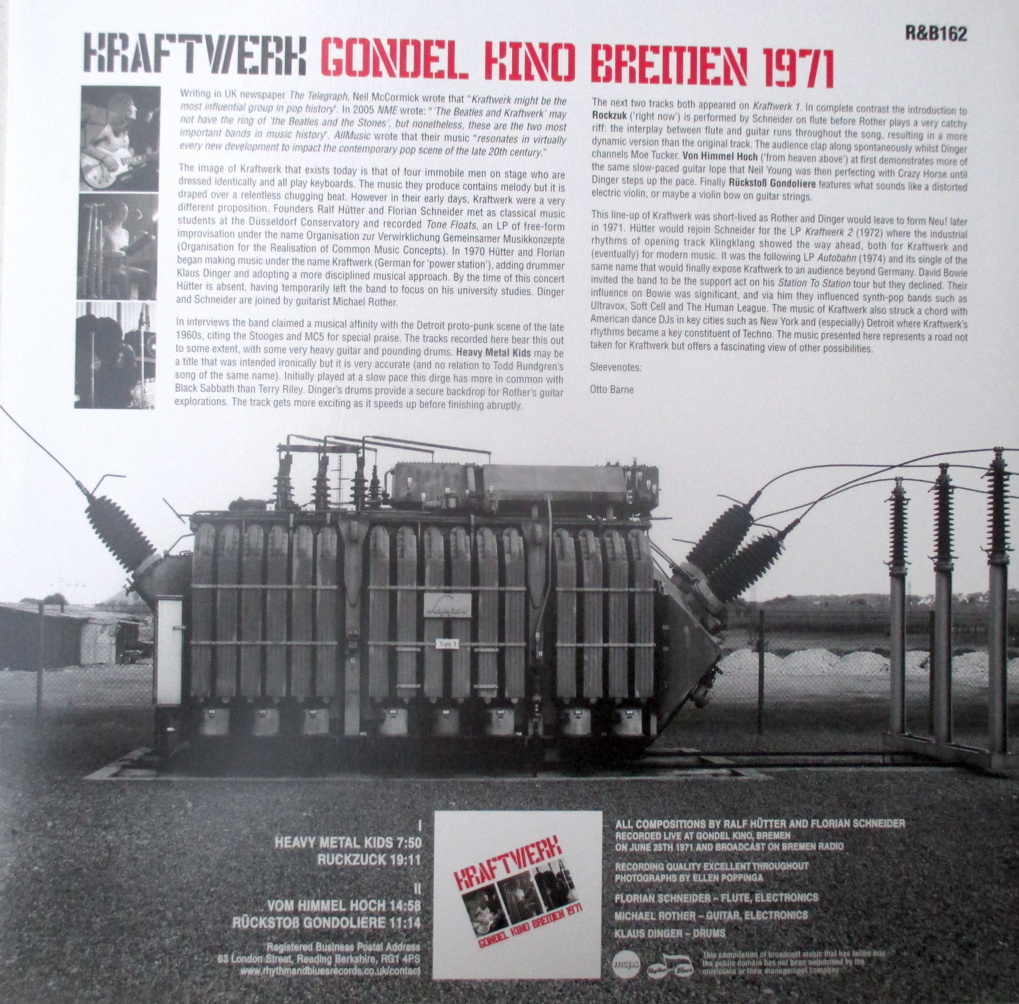 This line-up of Kraftwerk was short-lived as Rother and Dinger would leave to form Neu! later in 1972. Hütter would rejoin Schneider for the LP Kraftwerk 2 (1972)where the industrial rhythms of opening track Klingklang showed the way ahead, both for Kraftwerk and (eventually) for modern music. It was the following LP Autobahn (1974) and its single of the same name that would finally expose Kraftwerk to an audience beyond Germany. An invitation from David Bowie to be the support act on his Station To Station tour followed: it was declined. Their affect on Bowie was significant (as was that of Neu!), and from him they influenced synth-pop bands such as Ultravox, Soft Cell and The Human League. The music of Kraftwerk also struck a chord with American dance DJs in key cities such as New York and (especially) Detroit where Kraftwerk’s rhythms became a key constituent of Techno. The music presented here represents a road not taken for Kraftwerk but offers a fascinating view of other possibilities.