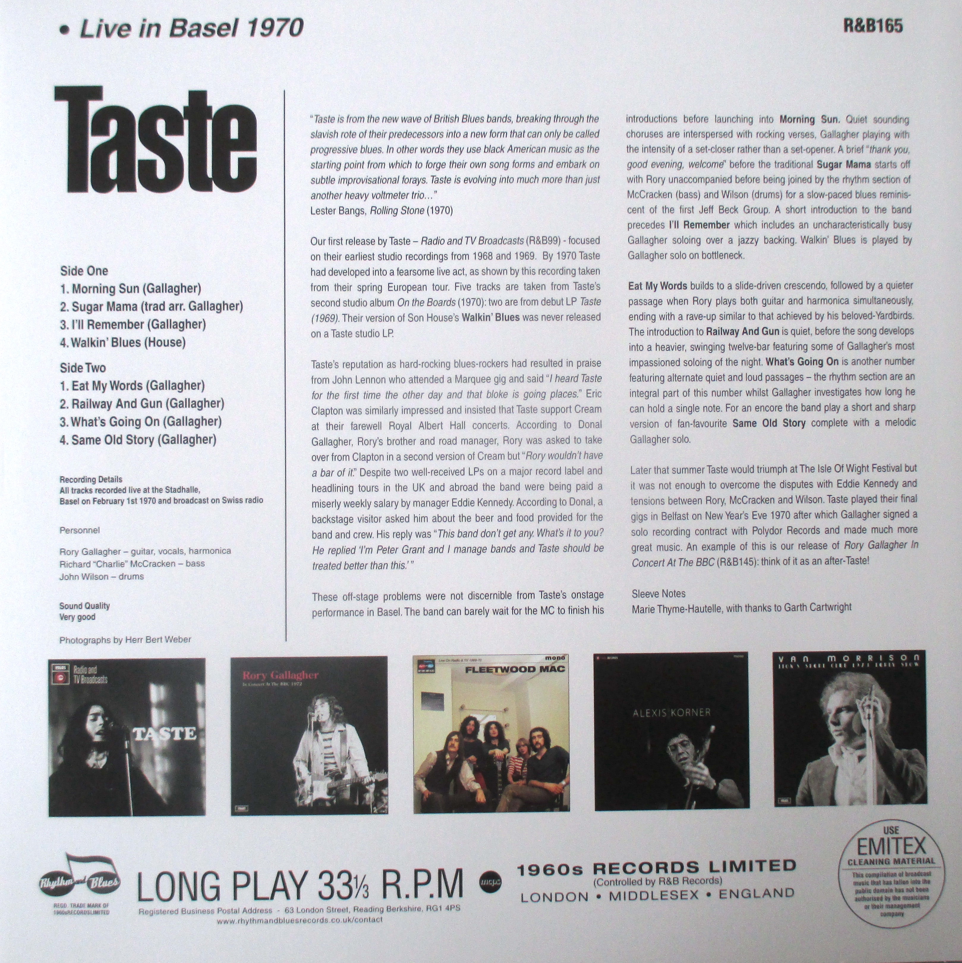 “Taste is from the new wave of British Blues bands, breaking through the slavish rote of their predecessors into a new form that can only be called progressive blues. In other words they use black American music as the starting point from which to forge their own song forms and embark on subtle improvisational forays. Taste is evolving into much more than just another heavy voltmeter trio…”